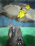 2019Net als bij “fietsen tegen de wind” is het werk symbolisch bedoeld. Bij dit schilderij heb ik met wat fantasie duiveltjes en clowntje toegevoegd.